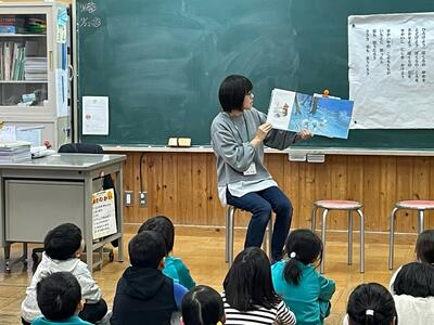 今月は読書月間です。朝学習の時間を活用して図書委員の児童や職員・フリップ(図書ボランティア)さんによる読み聞かせが行われています。子どもたちは、お話の世界に浸っているようです。