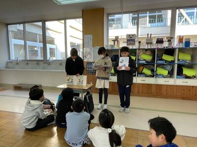 2月2日(木)、朝学習の時間、3年生児童による1年生への読み聞かせが行われました。国語「班で意見をまとめよう」で学習したことを生かし、各班のメンバーが役割を分担し、聞き手を意識した読み聞かせができていました。聞いている1年生の真剣な表情から3年生の想いが伝わっていることが伺えます。
