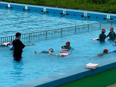 授業では、水の中に入ると重くて泳ぎづらいことや身体を浮かべるための技術などを学びました。