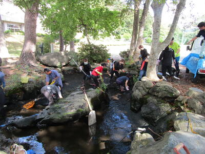 校舎内の窓ふきと池清掃に分かれて、1時間半ほどの作業となりました。
