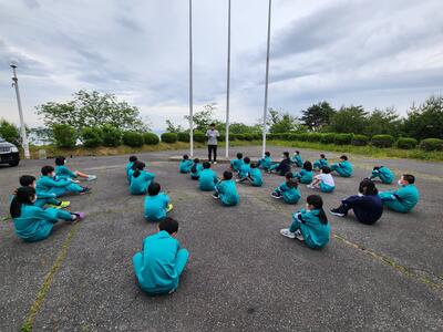 画像は朝のつどいの様子です。この後、雨が降り始めたものの予定通り沢登りを行うことができたようです。